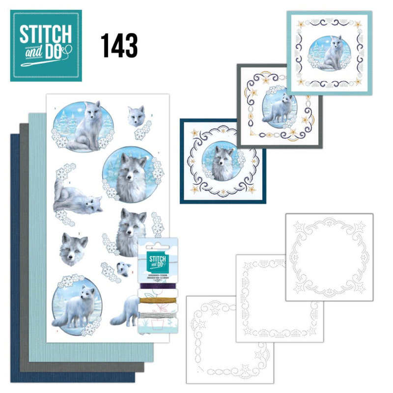 Stitch and Do 143 - Winter FoxesDeze handige borduursetjes bevatten drie 3D-afbeeldingen met 3 kleuren kaartkarton voor vierkante kaarten. Inclusief 3 x 50 m Stitch and Do Garen, 3x oplegkaartjes met een patroon en instructies. De oplegkaarten zijn voorgeprikt.…